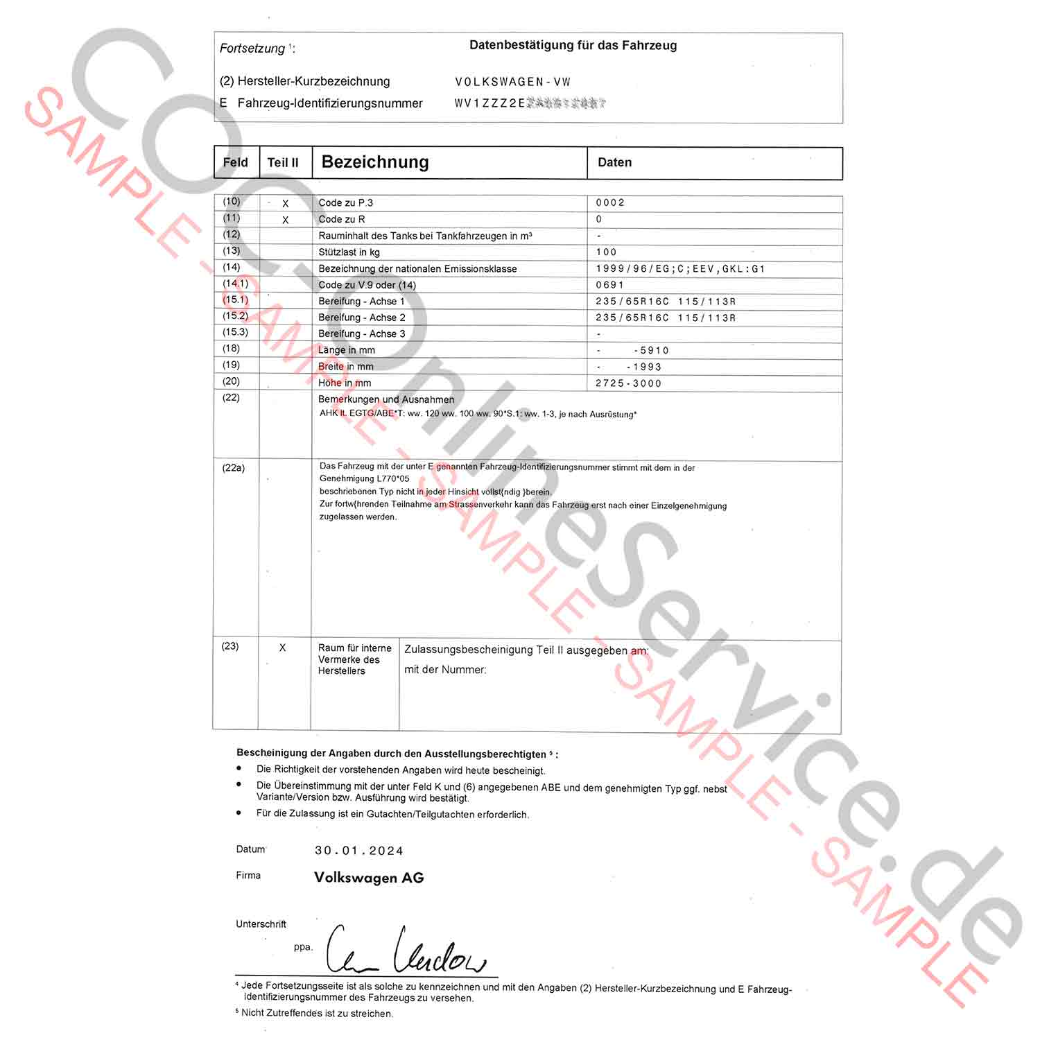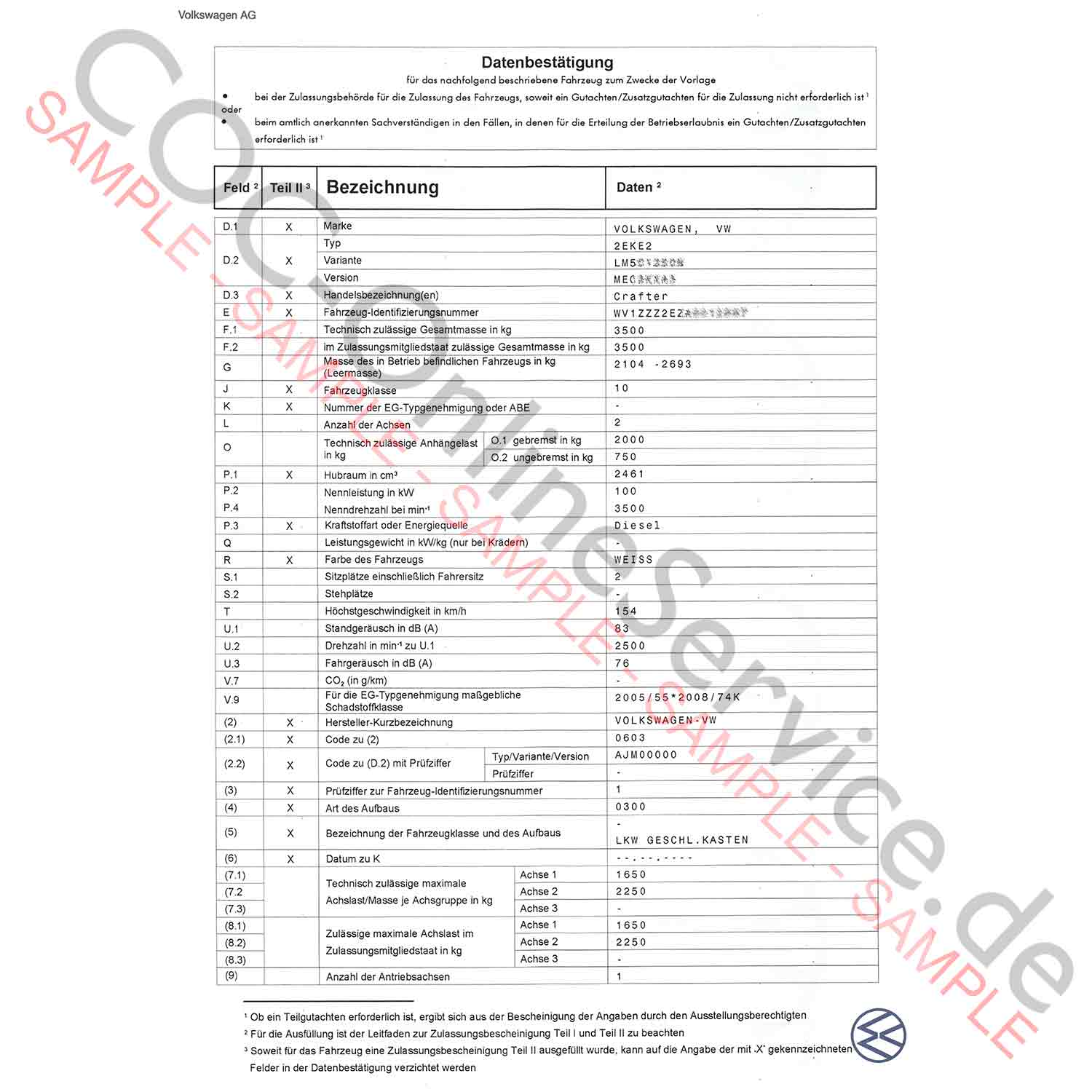 Dieses Datenblatt für die Marken Volkswagen PKW und Nutzfahrzeuge ist zur Unterstützung der Zulassung in Deutschland, falls dem Fahrzeug keine EG-Typgenehmigung zugrunde liegt und kein COC erstellt werden kann.